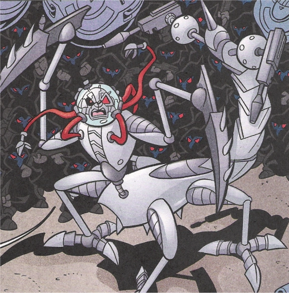 After receiving false information regarding Robotnik's demise, the various Grandmasters reacted in different ways, only to have their illusions shattered as they were teleported aboard the Death Egg for a conference with Robotnik. After reminding them of their expected loyalty and of his insurance—the explosives planted in their cybernetics—Robotnik gave the Legion instructions. They were tasked with locating the missing blue Chaos Emerald and continuing their missions of expansion, to be aided by the Metal Series. The former New Megaopolis chapter was also given the opportunity to choose its new location in reward for its loyal services to the empire. The chapter under Hugo Brass soon saw action under Robotnik's direct command, launching an attack on Central City. Robotnik would briefly contact the Raiju Legion before engaging in battle with the renegade Snively and the Iron Queen. Defeated, the Technomage was then appointed Grandmaster of Hugo's chapter, while Snively was imprisoned and replaced with an Infiltrator who served with the Iron Queen. (SU: #37, #38, #39, #40)