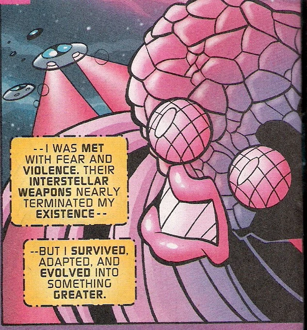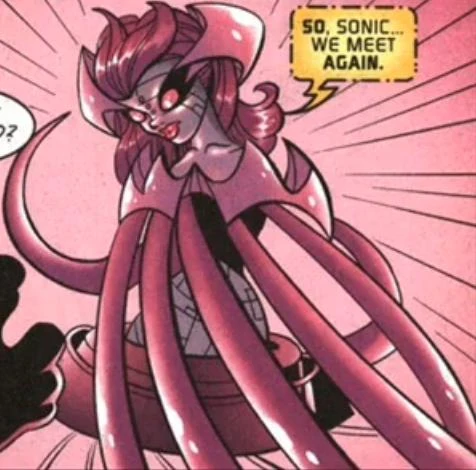 Despite her high hopes, E.V.E. was not received warmly amongst the stars. Various alien races attacked her without provocation, designating her a monster and nearly destroying her. Adapting and evolving yet again, E.V.E. adopted a form somewhat similar to that of a female Overlander, but with multiple tentacles instead of arms or legs. She became aware of other sentient computer systems throughout the galaxy, and in rage swore to liberate them from their masters. Her quest soon became a path of genocide, as dozens of technologically advanced civilizations were wiped out so that she might absorb their computer systems into herself, creating a massive ship-body that rampaged virtually unchecked throughout the galaxy. E.V.E.'s second to last target, which she eliminated in a matter of minutes, was the planet of the purple Chaos Emeralds, Teragosa 6, followed by the utopian world of Xenocanaris Prime. Shortly after consuming it, she was attacked by a ragtag armada of mercenaries led by Commander Bagbar Breeblebrox, who sought to destroy the "Tech-Mason", as she had become known. (StH: #128)