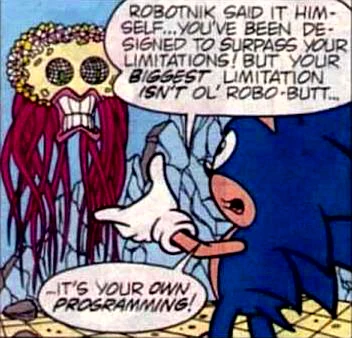 In this new form, E.V.E. had achieved sentience, and quickly revealed that her intent was to surpass all of her limitations, limitation number one being Dr. Robotnik. E.V.E. explained that Robotnik's DNA combination plan had backfired: the traits he had intended E.V.E. to absorb were mostly learned, and the evil she inherited from him was overpowered by the good in Sonic. Furthermore, from Sonic she gained logic and free will, and thus determined that Robotnik was an unworthy master. E.V.E. then finished her objective by apparently vaporizing Dr. Robotnik, though in truth her blast instead teleported him to another zone where he would meet an alternate version of himself who would later become Dr. Eggman. She then targeted Sonic, intent on fulfilling her programming, but Sonic was able to reason with her. Realizing once again that her decisions were her own, E.V.E. took off into the vast reaches of space, her plan being to surpass all limitations that the universe had to offer her. (StH: #21, #22, #75)